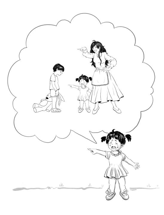 小女孩回忆说,哥哥抢了我的玩具,所以妈妈骂哥哥,哥哥不应该抢了我的玩具。